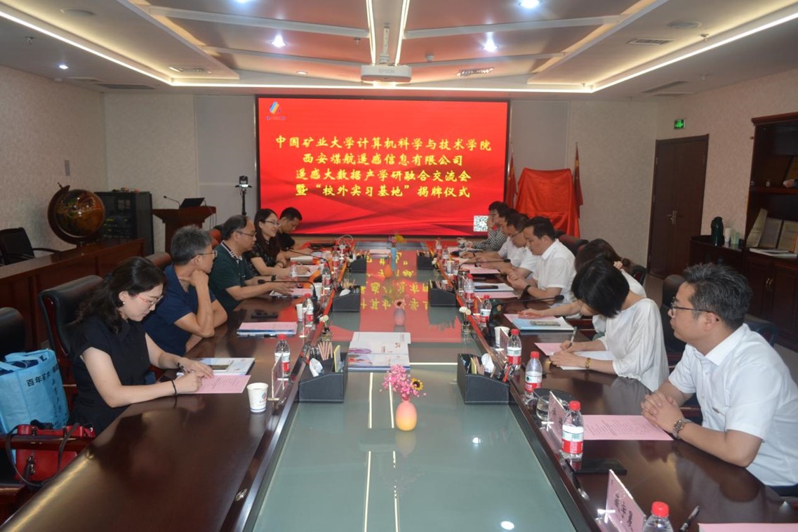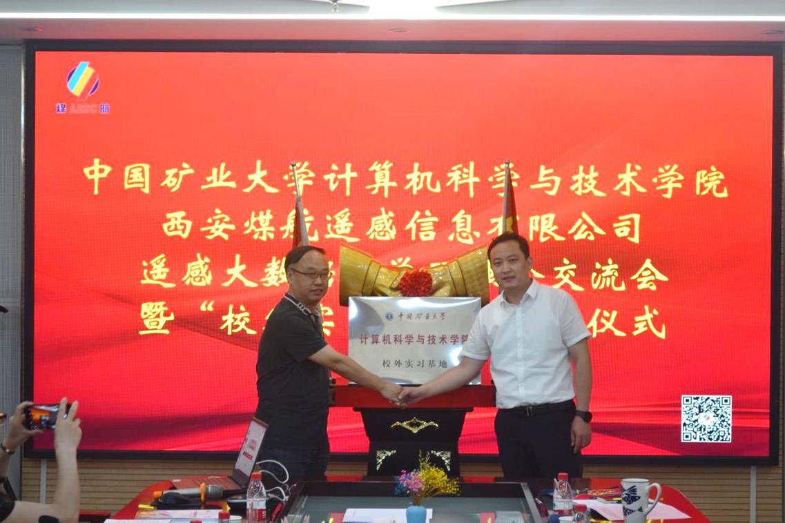 周勇院长介绍了学院的总体情况、此行的目的,高度肯定了煤航遥感在科技创新领域的前瞻布局、现有成果,对乡村振兴战略下深挖推广三农的数据价值、推进矿山企业智改数转等提出了意见。与会双方针对遥感大数据战略发展方向的常态化多维度产学研融合、专家咨询机制、学生联合培养、近年来矿大毕业生的就业及发展情况等事宜进行了深入交流。座谈后,周勇与杨创为联合共建的“校外实习基地”进行揭牌。